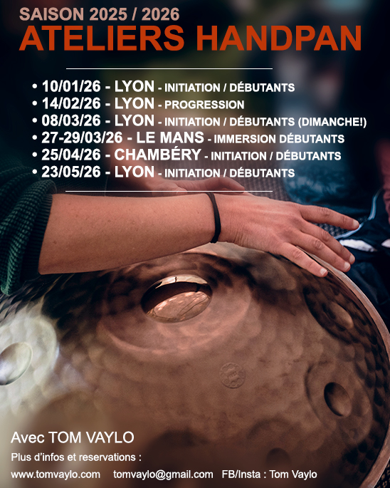 Les stage sont animé par Tom Vaylo, professeur de Handpan depuis 12 ans, musicien depuis 30 ans (7 albums), et passionné de pédagogie et de transmission. Durant ces dernières années, Tom a développé une méthode unique d’apprentissage du handpan, basée sur une approche ludique et pédagogique, réfléchie, éprouvée et efficace.